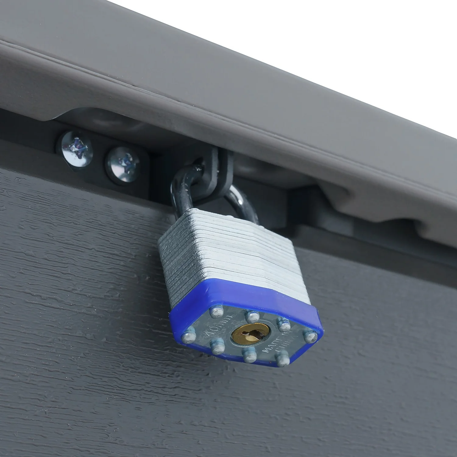 Need a more convenient place to store items around your yard? Lifetime’s Deck Boxes are the perfect way to expand your storage and get better access to items you use regularly around your yard. Whether you have gardening tools, lawn equipment, yard games, or even outdoor seat cushions, the Deck Box makes them easy to store and find when needed. The Rough Cut™ Texture has the natural look and feel of wood without the maintenance of painting or staining. It is durable, UV-protected, and weather resistant to ensure your belongings have years of protection. The lid is lockable (lock not included) to provide even greater security and has a controlled spring-hinge for easy opening and closing. It has moulded side handles for easy transport, making it easy to move around your yard or patio and it is even sturdy enough to be used as a bench. The Lifetime Deck Box blends durability, convenience and style to create a versatile storage solution.