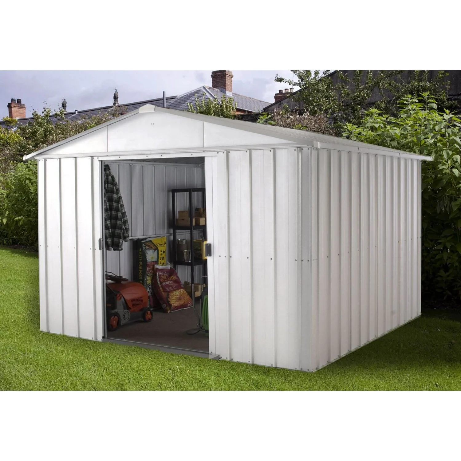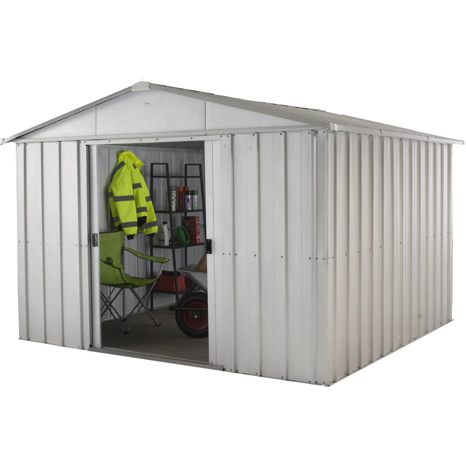 The Yardmaster Apex Roof Metal Shed 10ft x 13ft has double sliding doors and offers a practical storage solution for any garden.